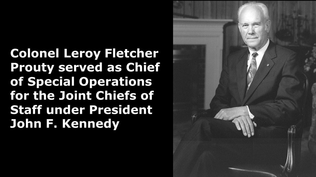Colonel Leroy Fletcher Prouty served as Chief of Special Operations for the Joint Chiefs of Staff under President John F. Kennedy. He was a colonel in the United States Air Force, he retired from military service to become a bank executive.